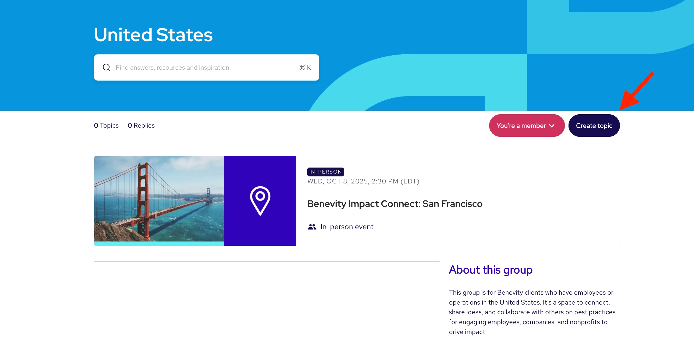 How are groups different from discussions? Discussions allow you to dive into topic-specific forums to connect on what matters most to you. Think: volunteering, giving, ERGs, ambassador programs, grants management and navigating program risk. Groups allow you to connect with your peers in a specific industry or location.